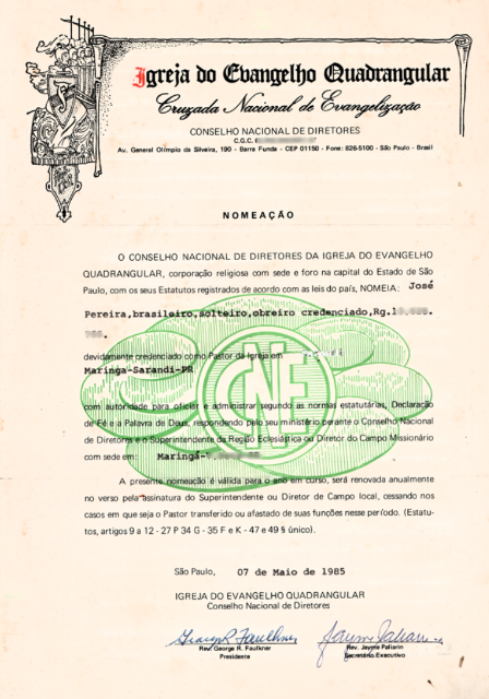 A carteirinha que registra o batismo de José Pereira na Igreja do Evangelho Quadrangular de São José dos Campos, em 1983, marcando o início de sua nova vida em Cristo. (Ver Capítulo 6)