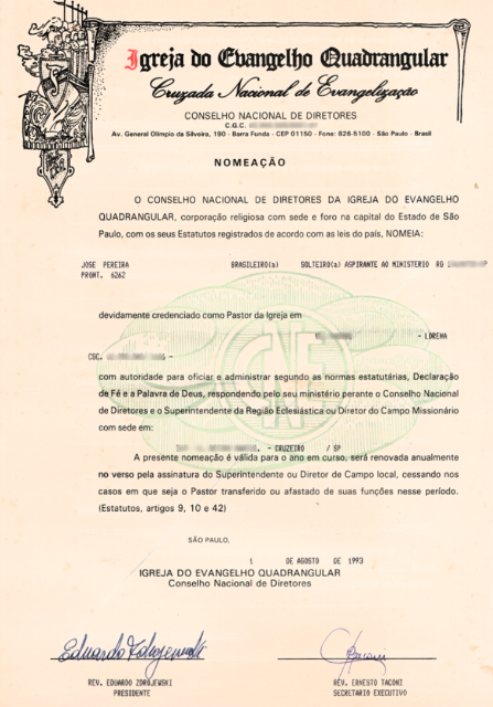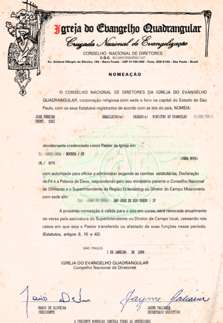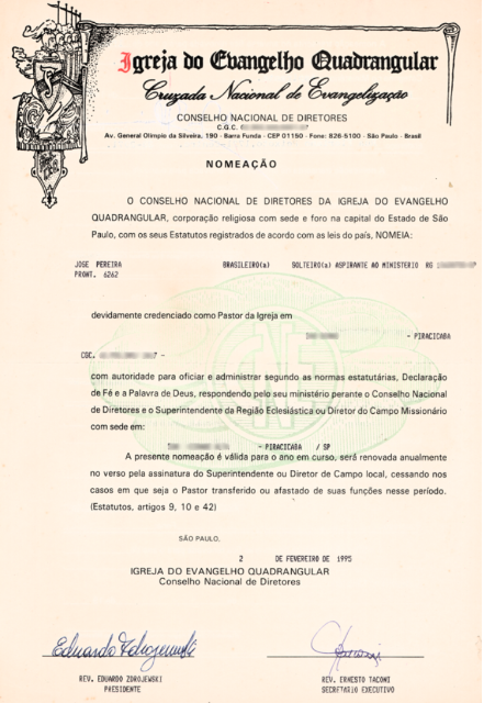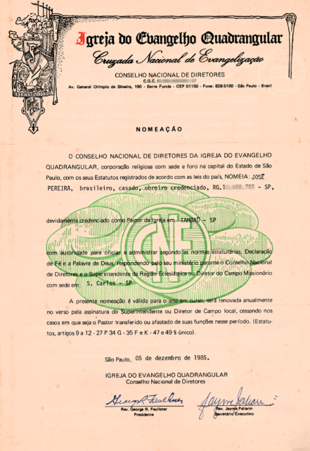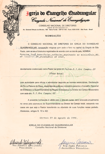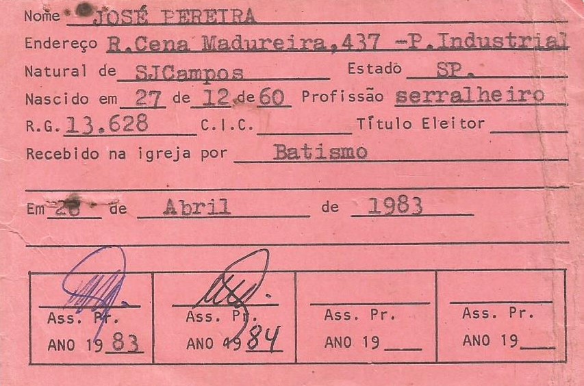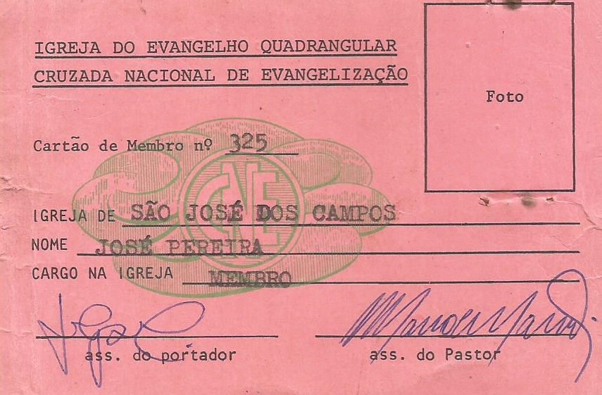 A carteirinha que registra o batismo de José Pereira na Igreja do Evangelho Quadrangular de São José dos Campos, em 1983, marcando o início de sua nova vida em Cristo. (Ver Capítulo 6)
