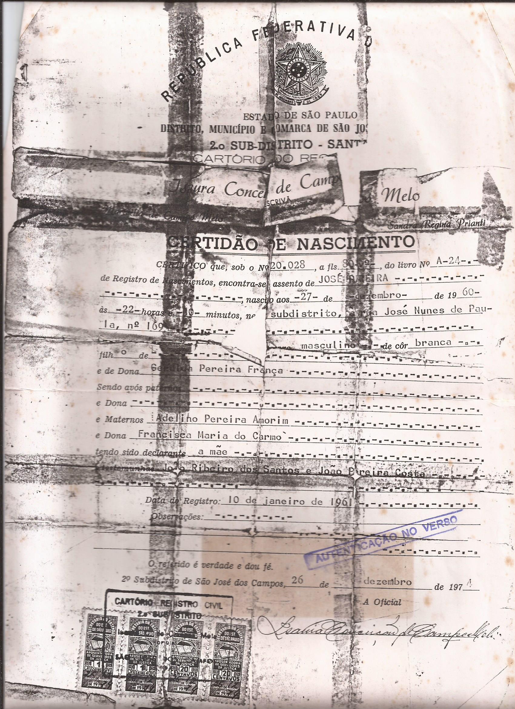 Documento que comprova a data de registro de José Pereira, revelando um detalhe marcante de suas origens. (Ver Capítulo 3)