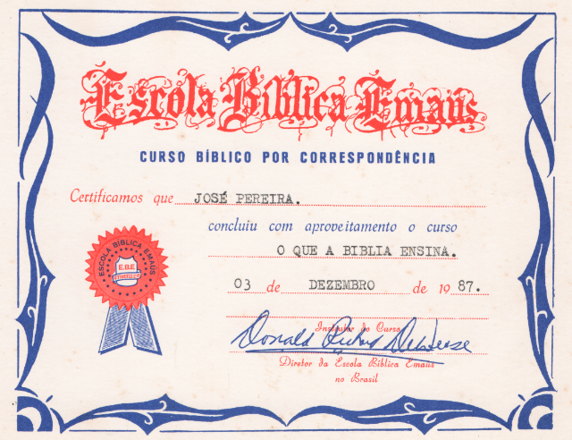 Certificado Escola Bíblica Emaús 1987