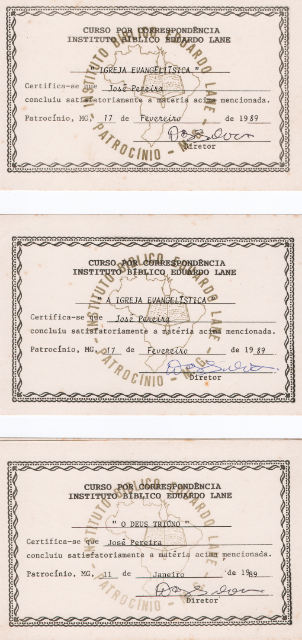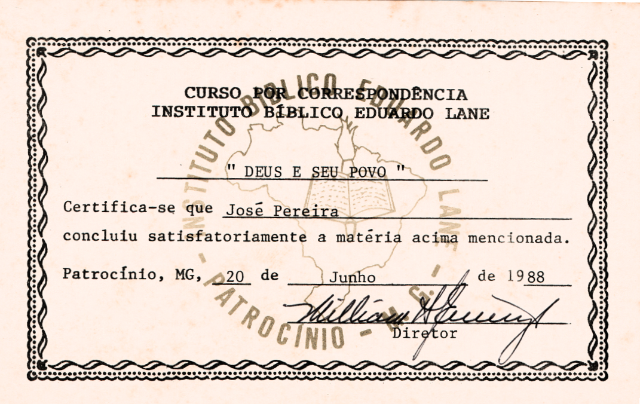 Registro de conclusão da matéria "Deus e Seu Povo" do Instituto Bíblico Eduardo Lane em 1988, parte de sua formação contínua. (Ver Capítulo 6)