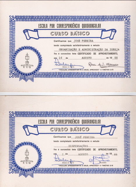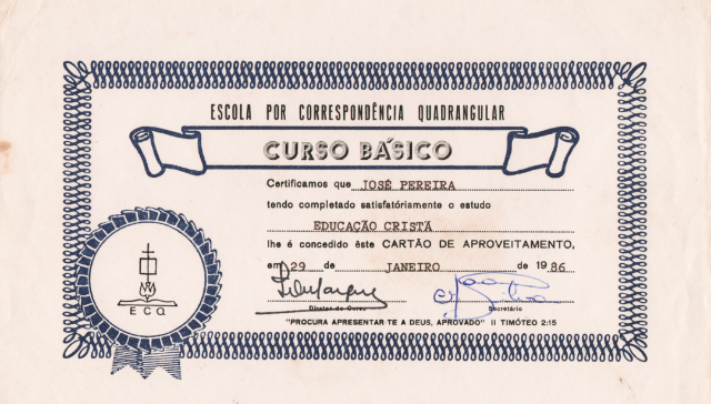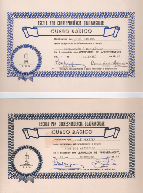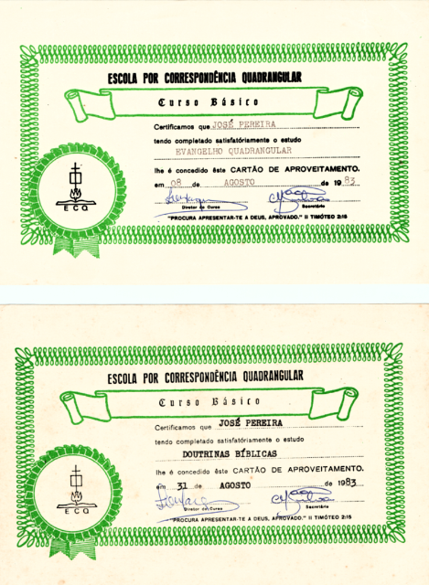 Registros de seu estudo no Curso Básico de Teologia por Correspondência da Igreja Quadrangular em 1983, evidenciando sua sede por conhecimento da Palavra. (Ver Capítulo 6)