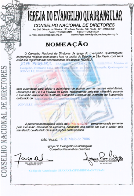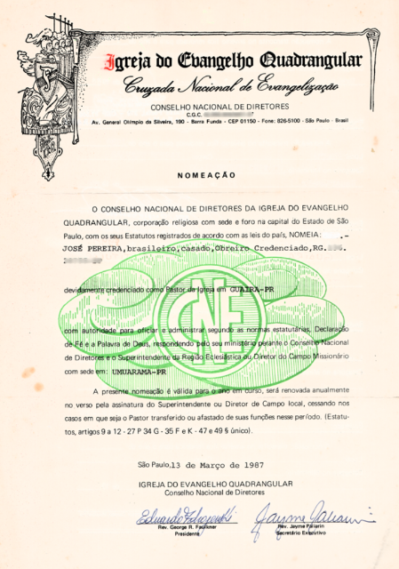 Certificado ITQ 1988 (Organização da Igreja)